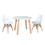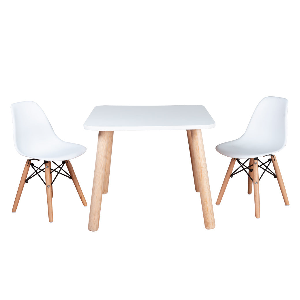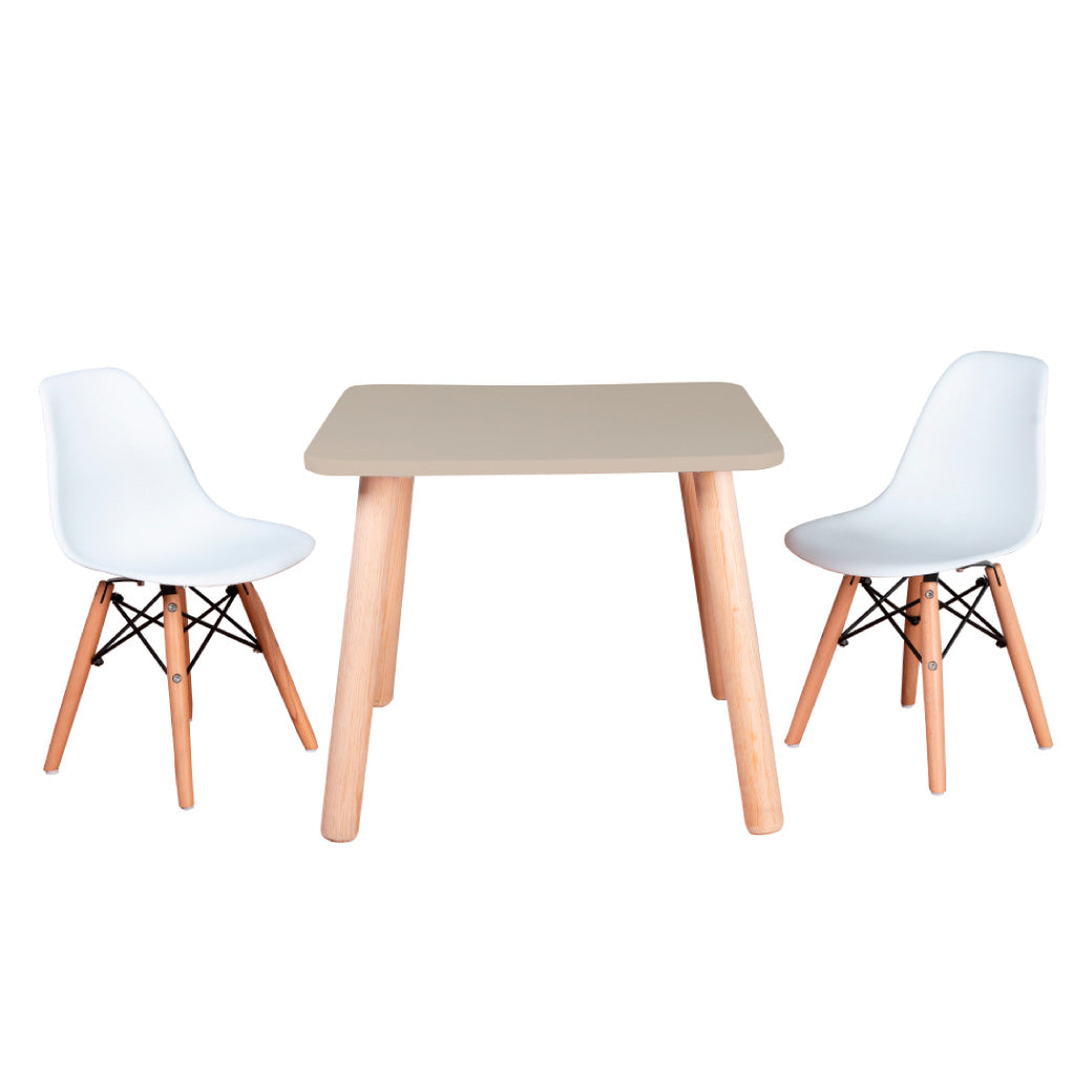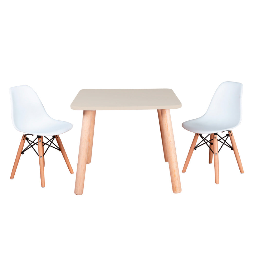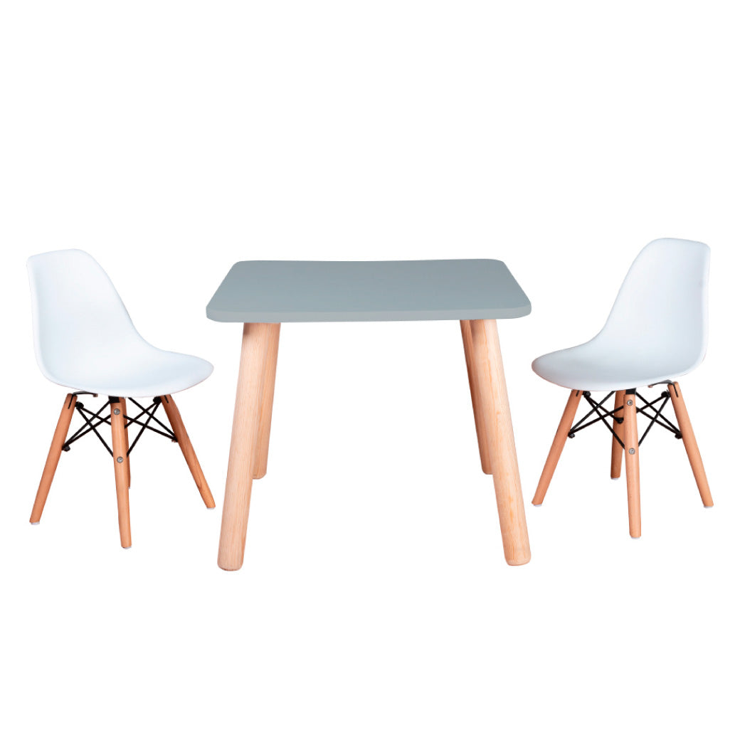 Comedor infantil en madera de diseño moderno, compuesto por una mesa de forma cuadrada y dos sillas Eames. Ideal para que los niños y niñas de 2 a 9 años hagan su tarea, coman, dibujen o jueguen con su tablet en un entorno cómodo y seguro. Fabricado con materiales resistentes y acabados seguros, este set aporta un toque contemporáneo a recámaras y salas de juego, combinando funcionalidad y estilo para crear un espacio infantil moderno.. |