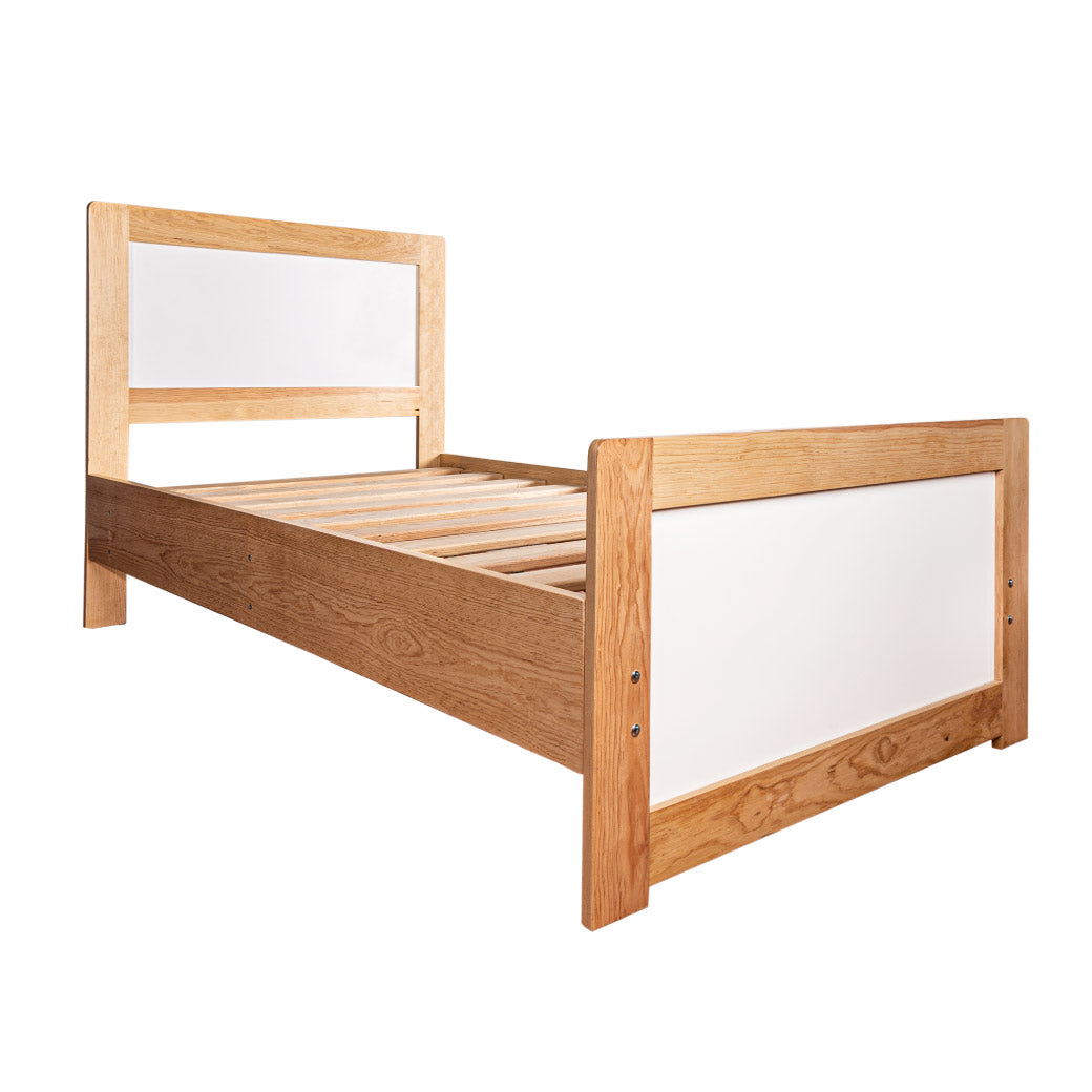 Cama Natura de madera con barandales desmontables. Úsala de los 2 a 8 años y conviértela en cama individual duradera.