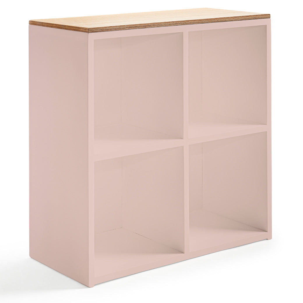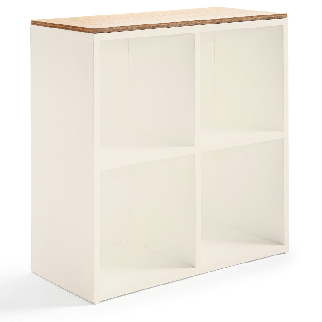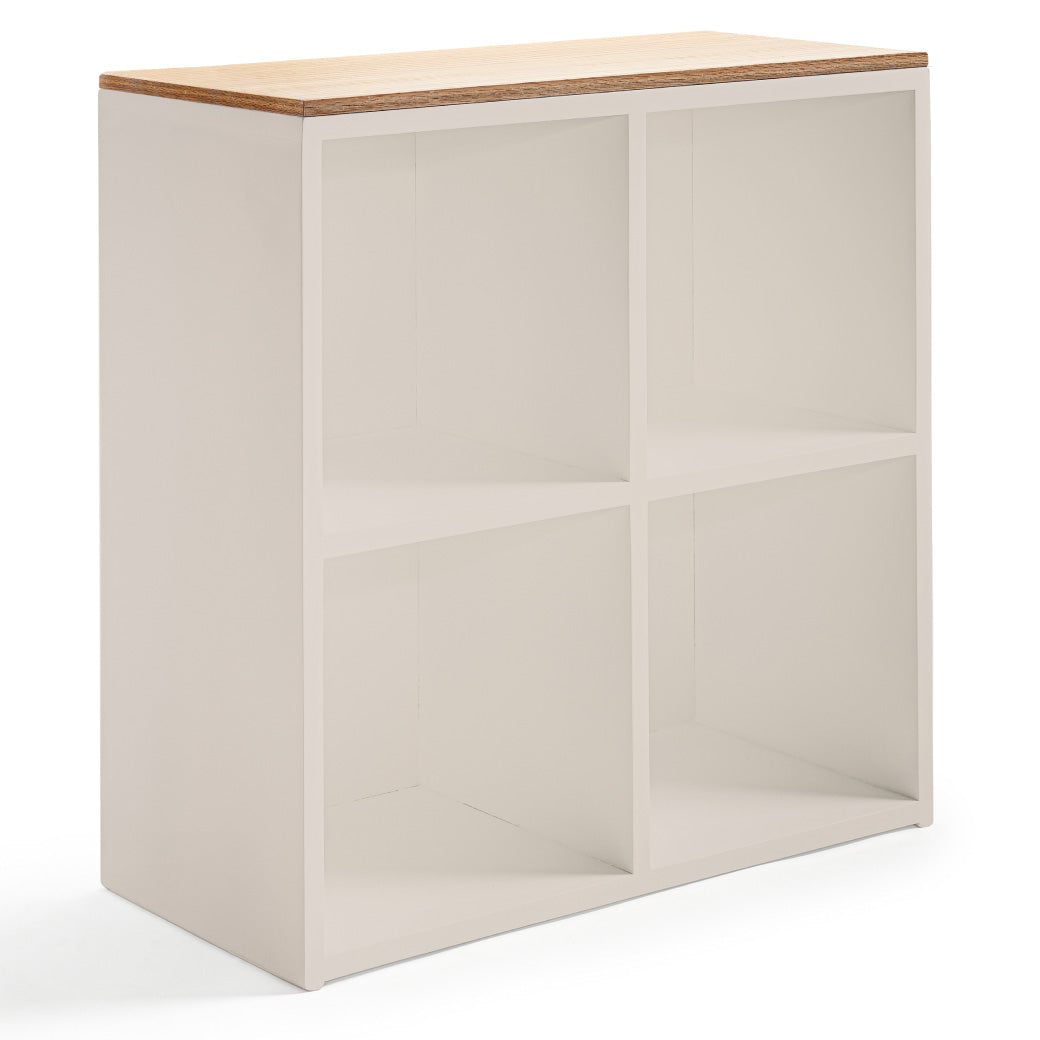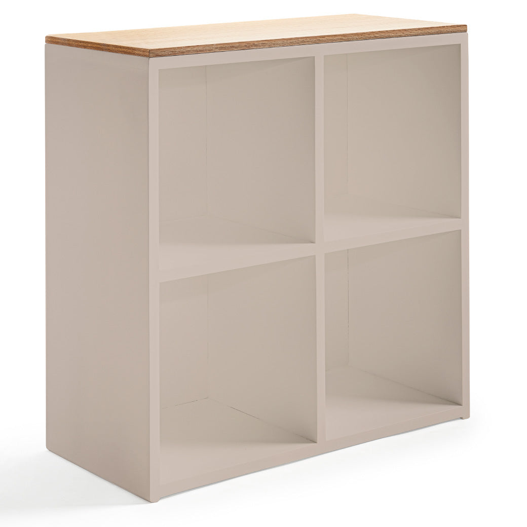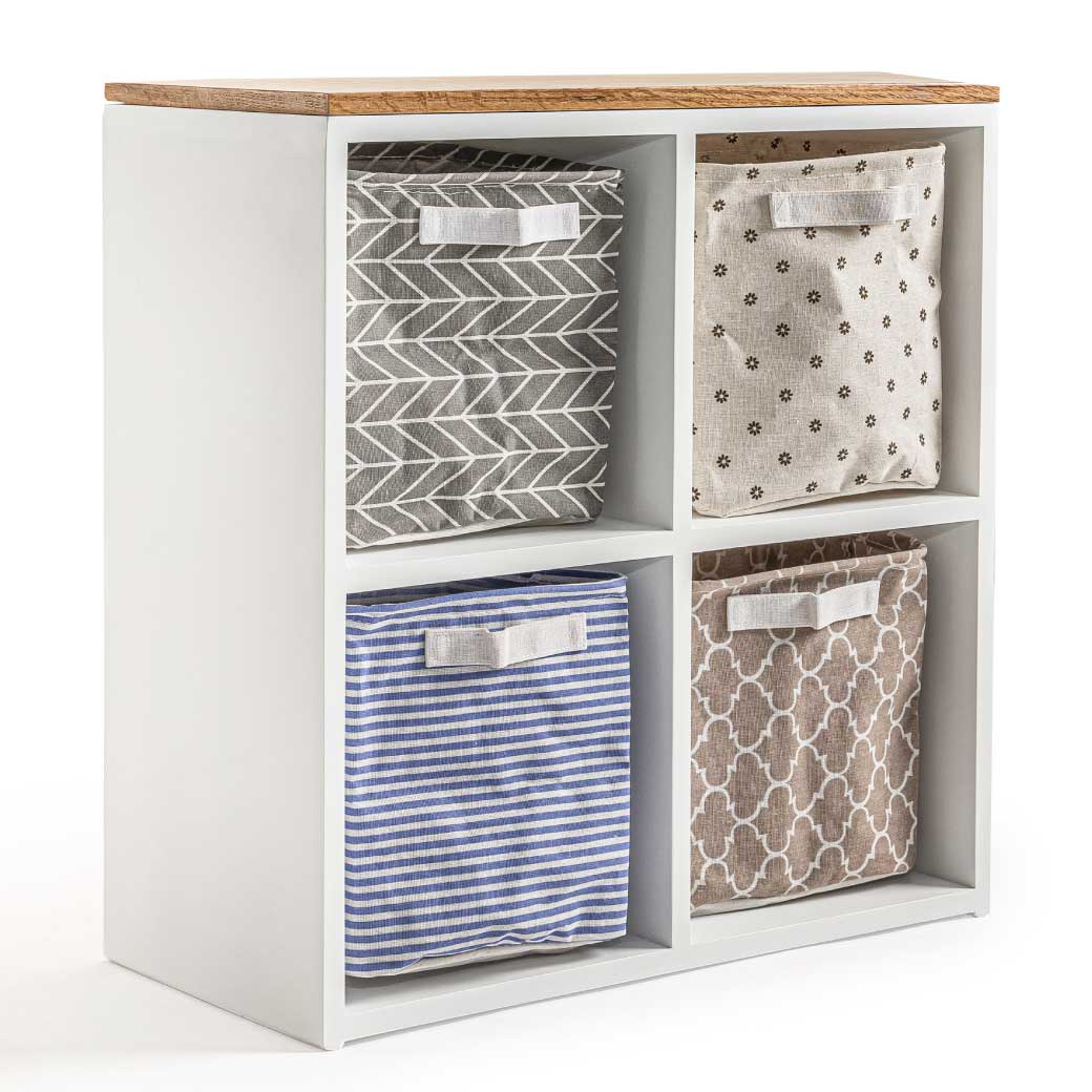 Estantería infantil de madera con cubierta de encino y 4 espacios para canastas o uso libre. Ideal para organizar y decorar cuartos infantiles.