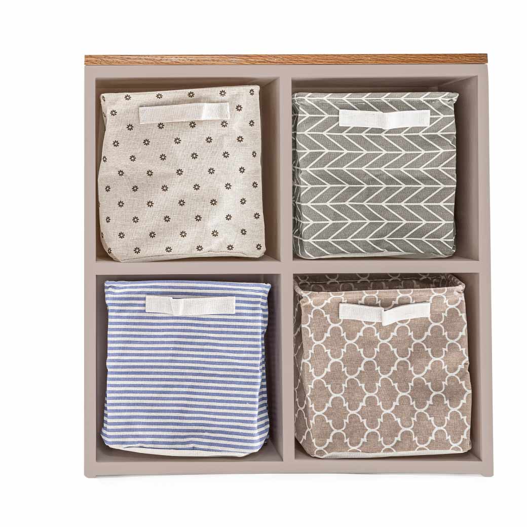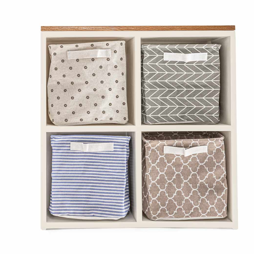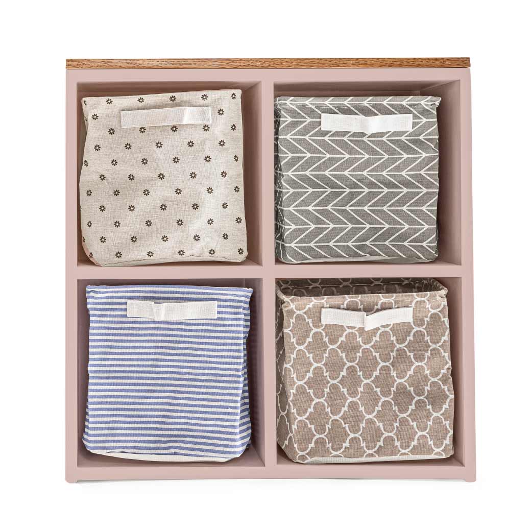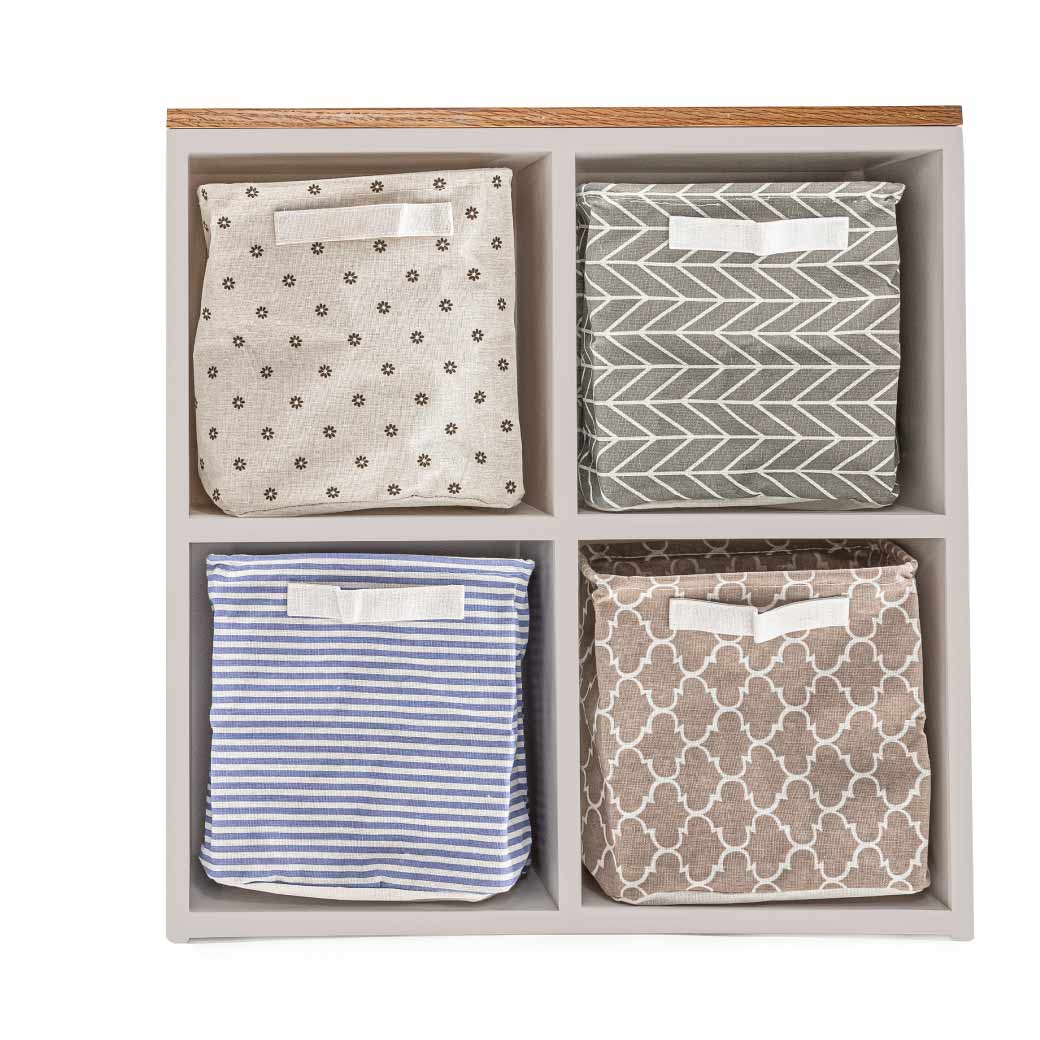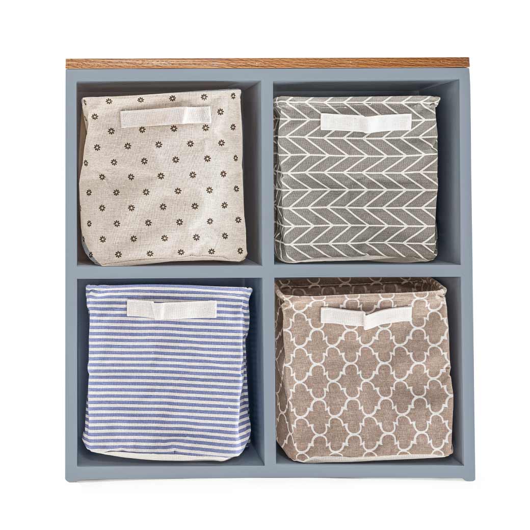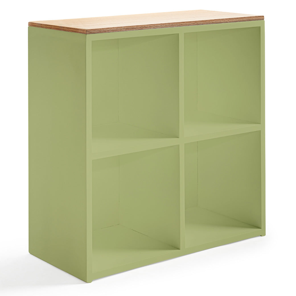 Estantería infantil de madera con cubierta de encino y 4 espacios para canastas o uso libre. Ideal para organizar y decorar cuartos infantiles.