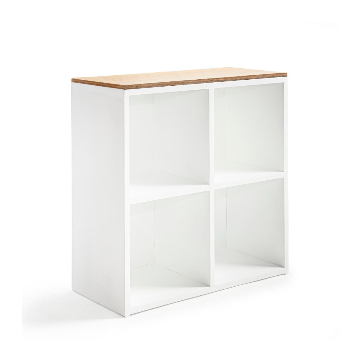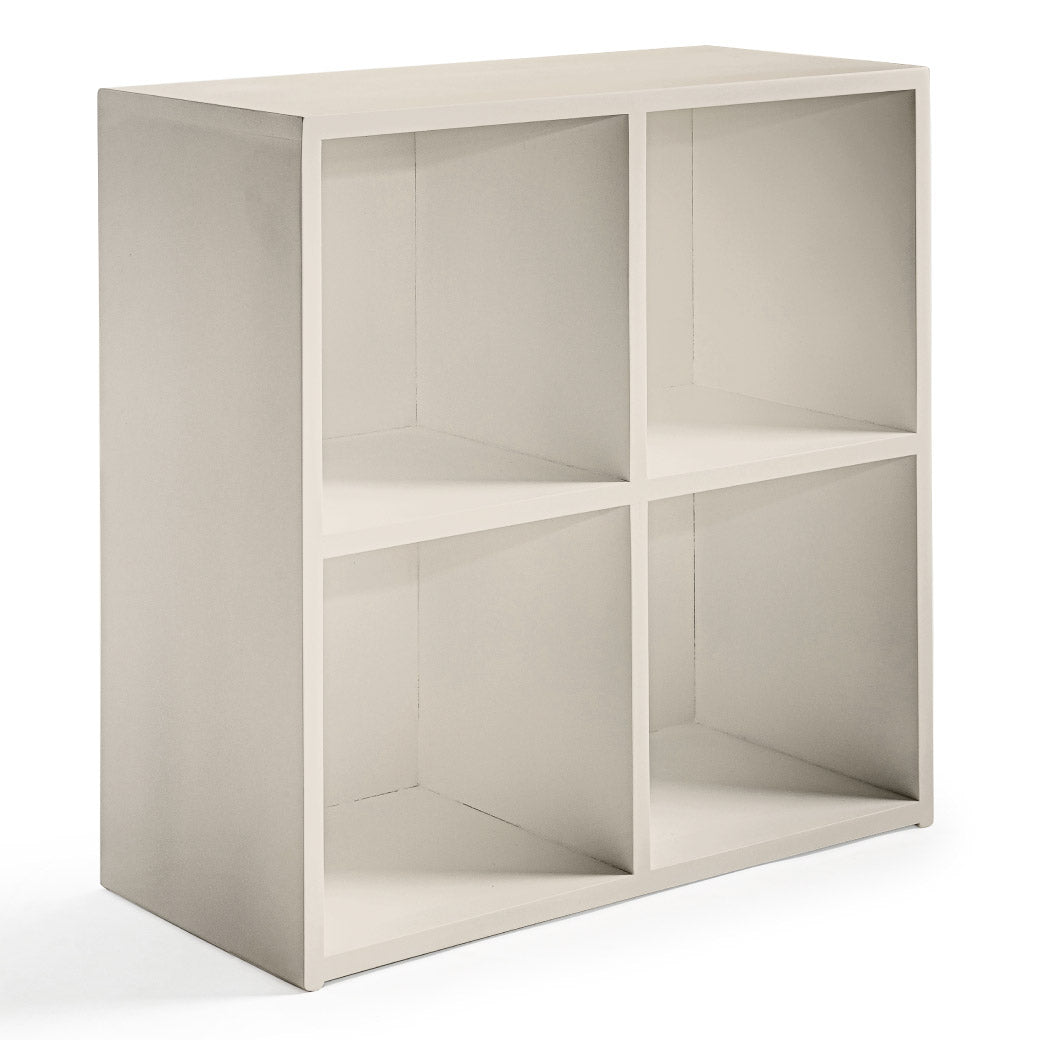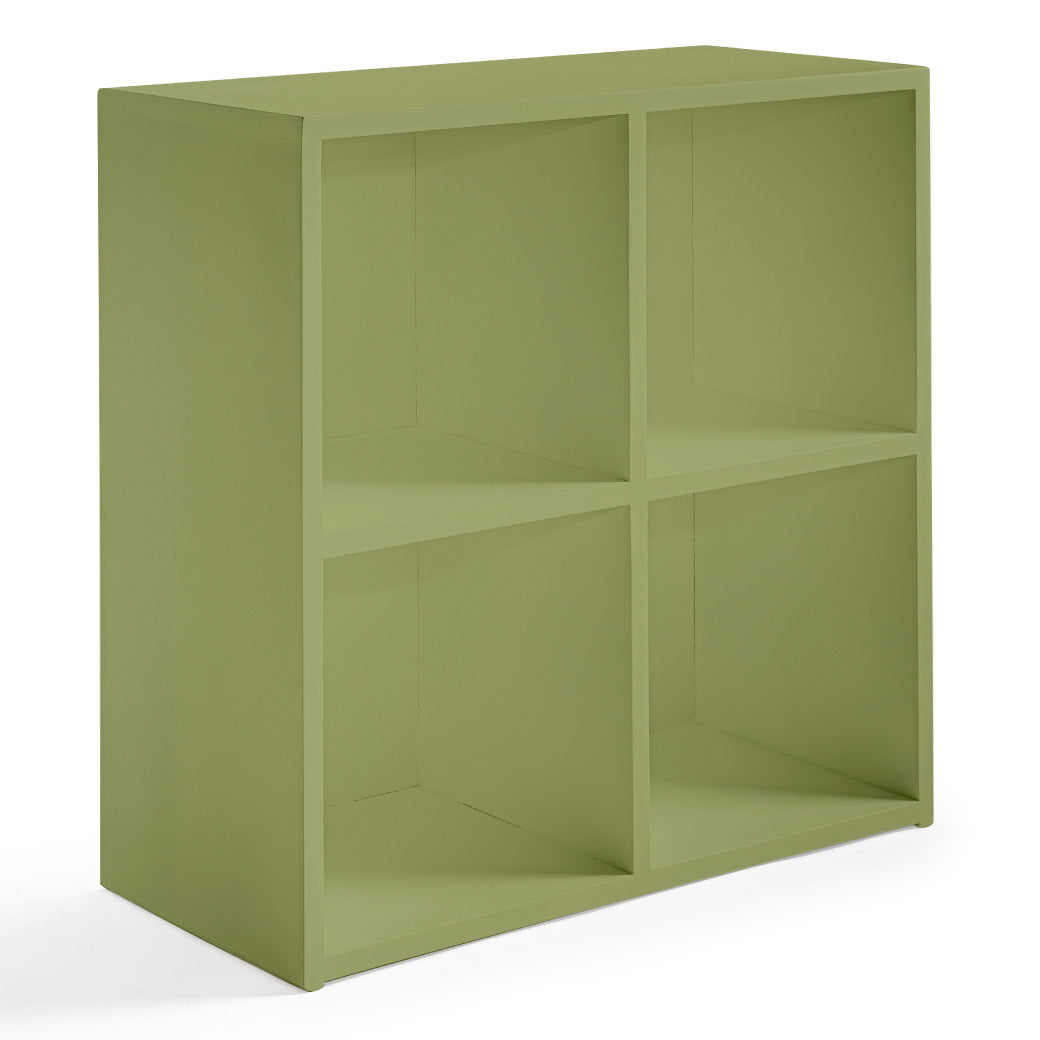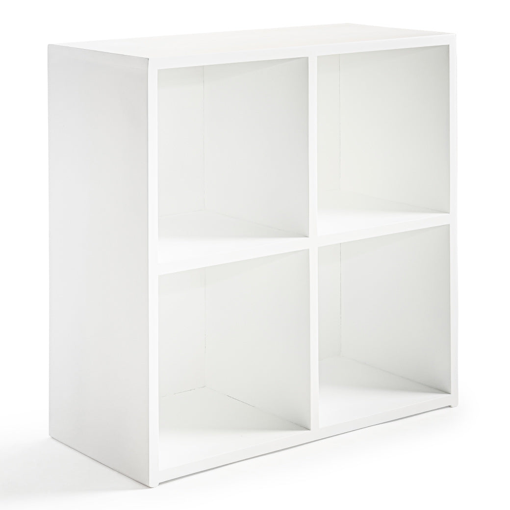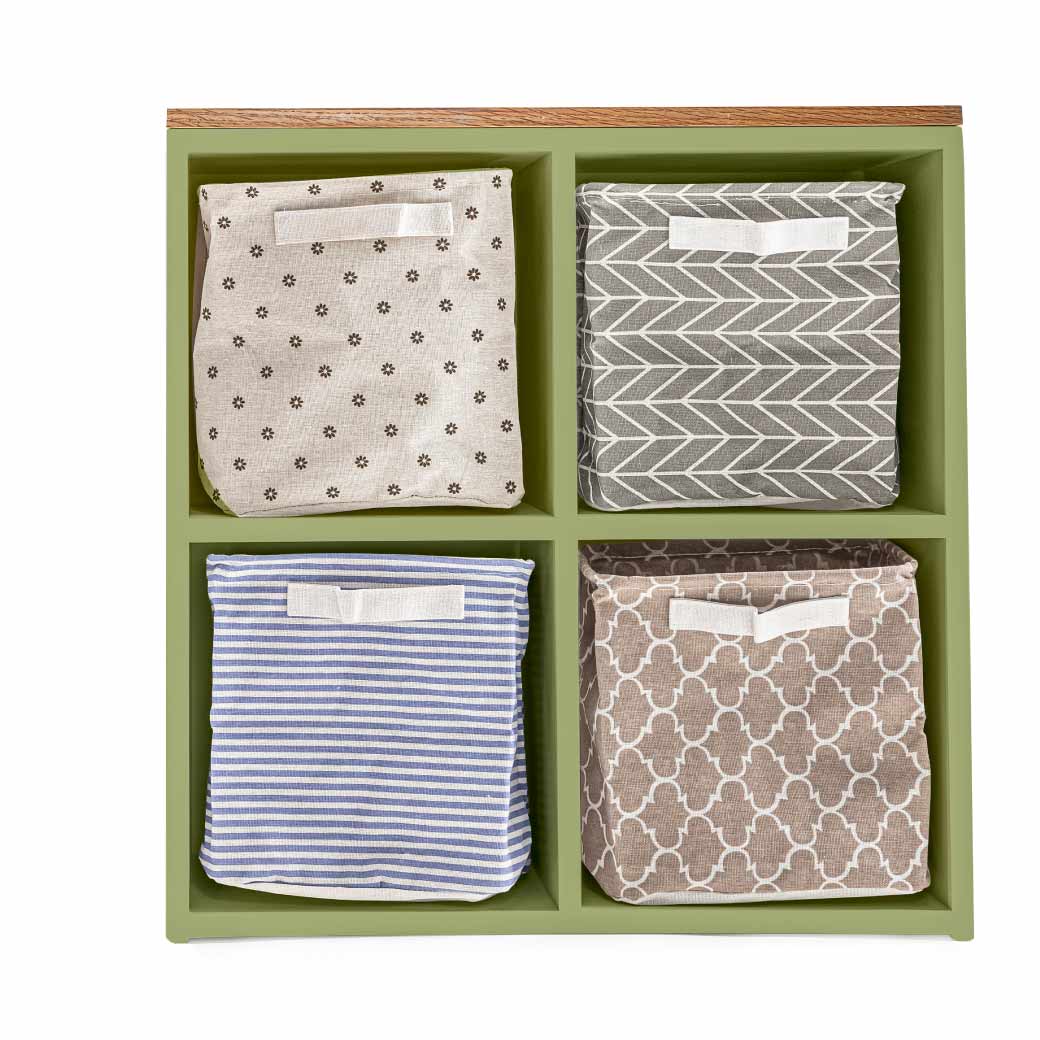 Estantería infantil de madera con cubierta de encino y 4 espacios para canastas o uso libre. Ideal para organizar y decorar cuartos infantiles.