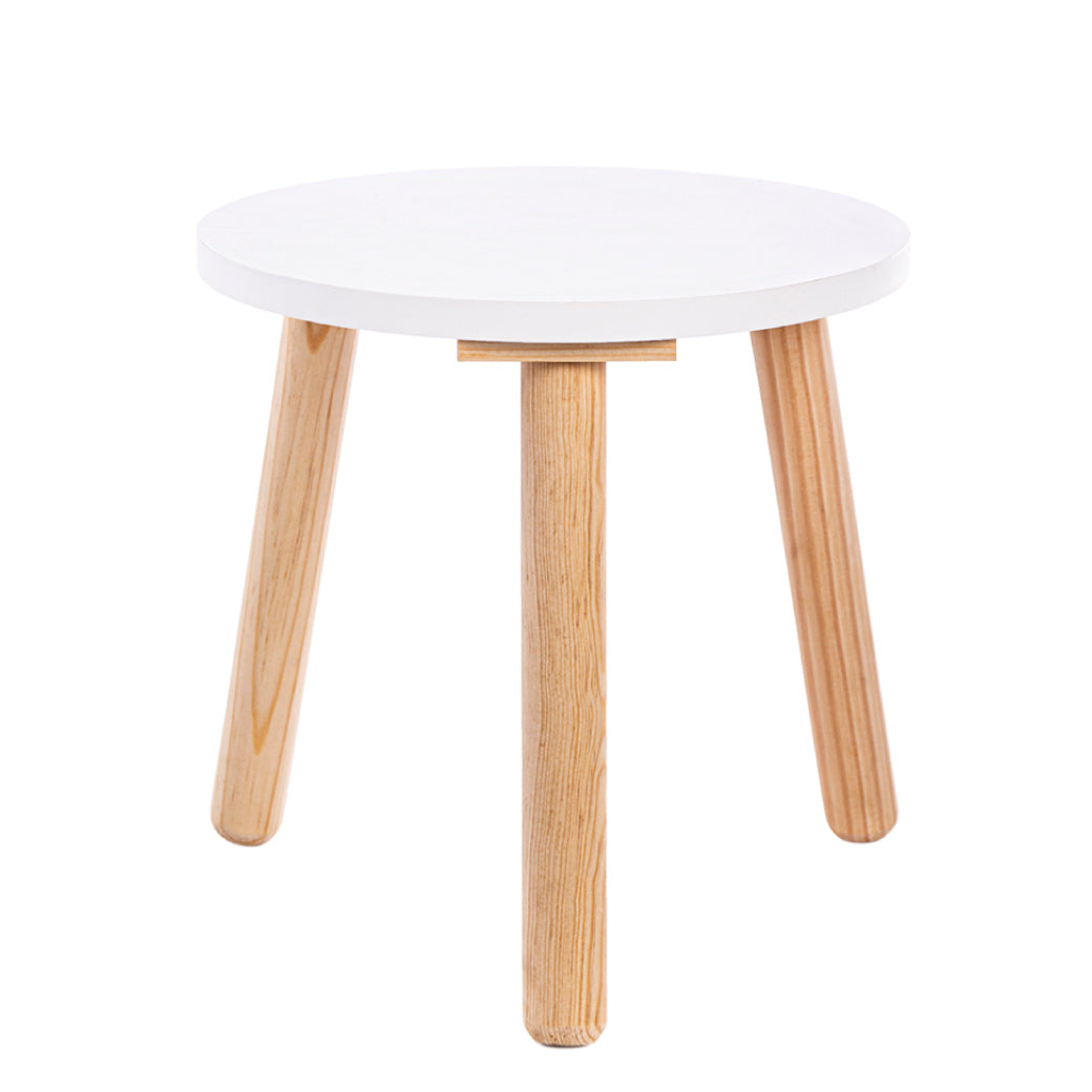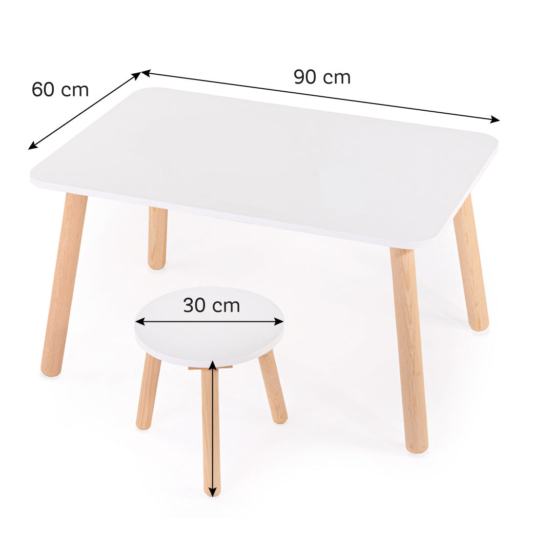 Set infantil con mesa rectangular y banco circular. Funcional, moderno y hecho con melamina y pino. De 2 a 9 años.