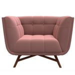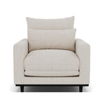 Sillón de estilo moderno que destaca por sus formas rectas y estética depurada. Cuenta con brazos acolchonados de líneas definidas, respaldo alto que brinda soporte ergonómico y un asiento amplio que invita al descanso. Sus patas de madera, con una sutil inclinación hacia el exterior, aportan un detalle distintivo que realza su diseño contemporáneo y elegante. |